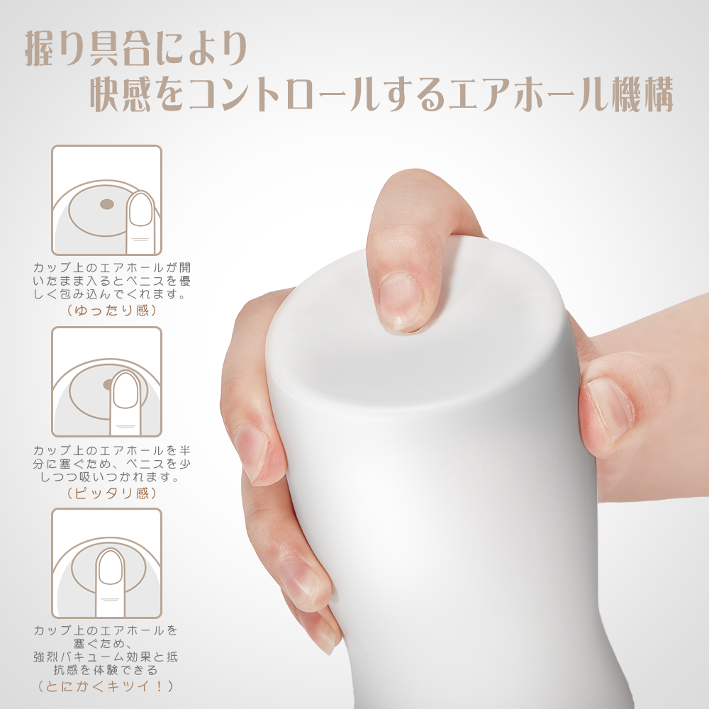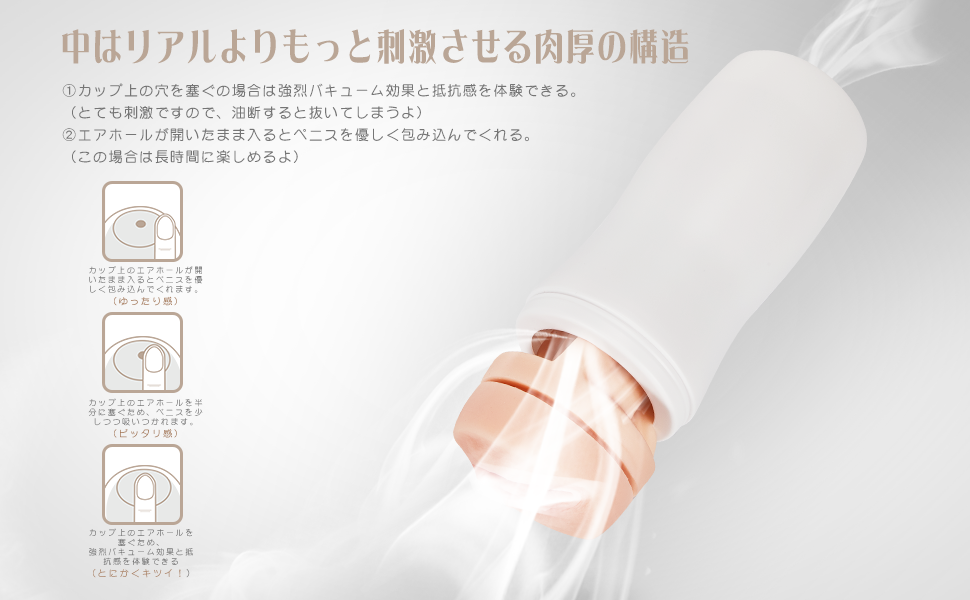 - 【三つバキューム効果】底面の空気穴でバキュームの調節が可能な繰り返し使えるカップホール。使用中、本体上部のエアホールを押さえることにより、より一層、バキューム効果がアップします。 きつい?ゆるい?まったり?オナホの使用感、自分で決める!