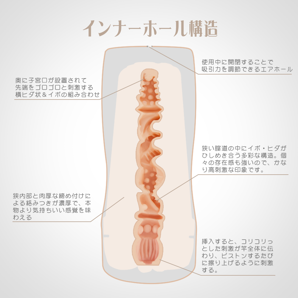 - 【リアル系カップホール】リアル肉厚感とリアル挿入感を追及したインナーホールで、ぜいたくな密着力を実現。にゅるんと吸い込まれるような入り口に、コリコリとしたヒダとイボの中央部。キュンキュンと締め付けの最深部の子宮口までくると、イくのを我慢できなくなるでしょう。リアル体験とは違う、別格の感覚を味わってみてください。(エアホールのコントロールより、感覚も多少違います)